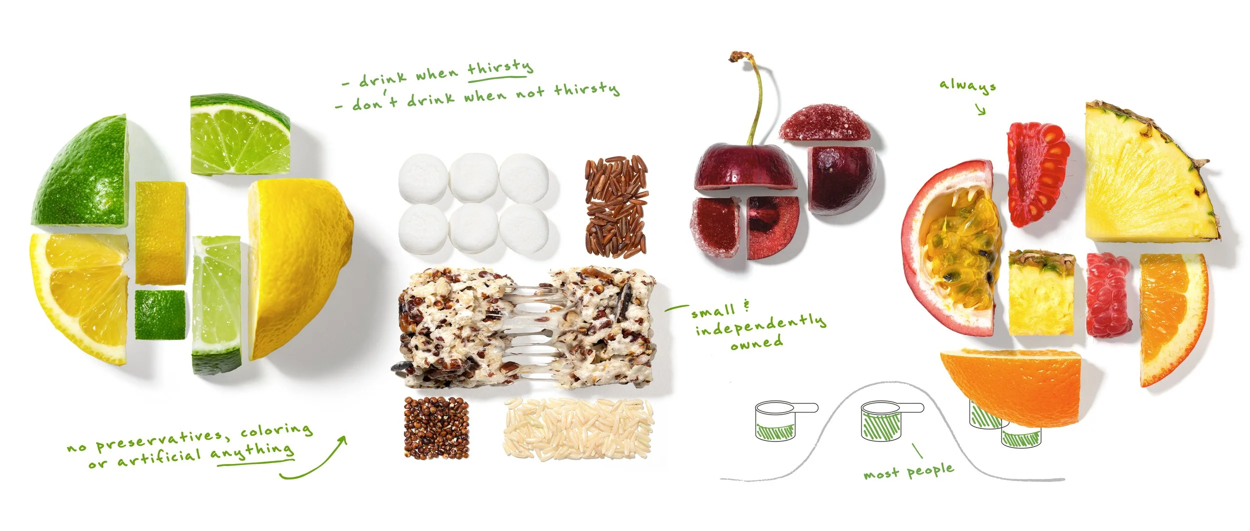 Our conceptual system kicked off by reimagining the brand’s long used pixelized fruit graphic…as fruit pixelized. But instead of a 90’s style treatment applied to an image, we busted out our good kitchen knives and actually cut up fruit, ingredients, and products to create ‘pixels’ that we then reassembled into the product’s final representation.